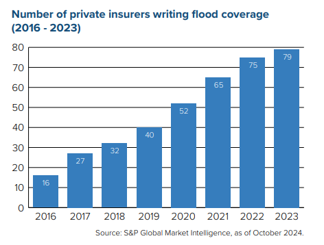 The private flood market has changed since 2016, when only 12.6 percent of coverage was written by 16 insurers. In 2019, federal regulators allowed mortgage lenders to accept private flood insurance if the policies abided by regulatory definitions. The already-growing private appetite for flood risk gained steam after that. Private insurers are gradually accounting for a bigger piece of a growing flood risk pie.